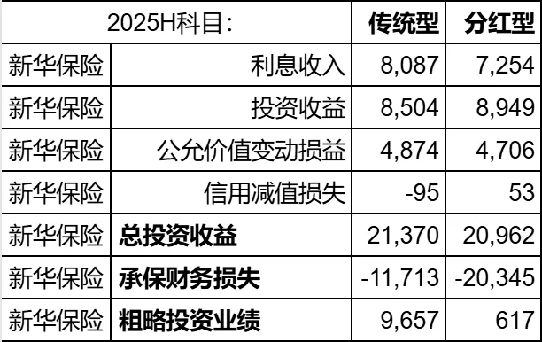 可以看到,虽然新华的传统型和分红型保险账户的总投资收益都在210亿左右,但是由于成本(也就是承保财务损失)差异很大,最后的投资业绩金额天壤之别,传统型账户差不多赚了100亿,而分红型账户只有6亿。