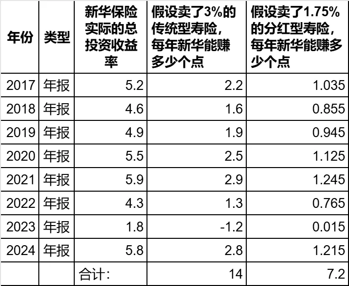 我假设2017年,新华卖出去一笔3%的传统型,和一笔1.75%的分红型,然后以2017年到2024年新华实际的总投资收益率来计算,不考虑复利等因素,我可以得到下面的这张图: