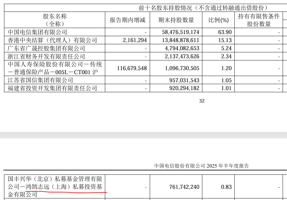 近一年,在很多大型红利股的十大股东名单里,都出现了一些私募基金的名字,比如下图是2025年中国电信中报的十大股东名单: