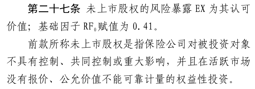 我们知道,监管层是通过风险因子来控制保险公司投资的不同资产的风险的,比如投资沪深300的股票,和投资一家没有上市的公司,当中的风险肯定是完全不一样的。所以沪深300的风险因子就会低,而未上市公司的风险因子就会高。
