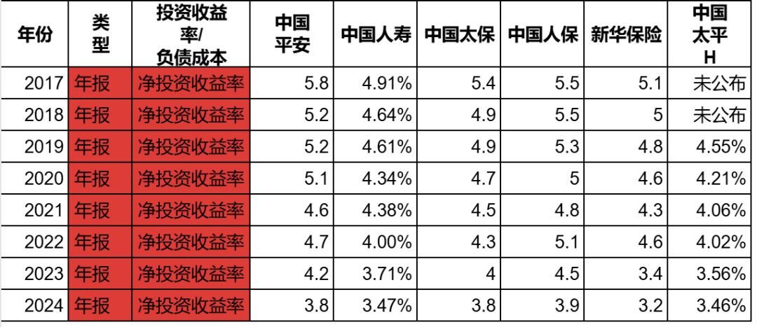 如果把这些因素都考虑进去,我认为,中国平安大概率是净投资收益率最高的,因为它在联营合营上吃了亏,人保占了便宜,即便这样,2024年,平安3.8,人保3.9。太保应该是第二,他没有算长期股权投资,也是3.8。人保可能在第三名。仅仅谈2024年的话。