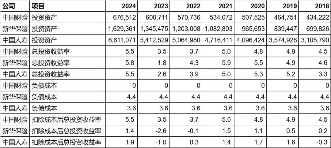 但是现在没有办法,想要知道负债成本,这可能是现在唯一的办法。我就直接用13精那篇文章里计算出来的2024年中国人寿和新华人寿的负债成本,分别是3.6%和4.4%,并且我假设2018年到2024年每一年的负债成本都是这么多。