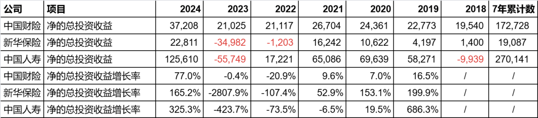2. 从7年累计的净的总投资收益情况看,中国财险可以说遥遥领先,几乎是新华的10倍,距离体量比自己大这么多的国寿,也相差不到40%。要是只算2018到2023的累计数,中国财险几乎和国寿打一个平手。