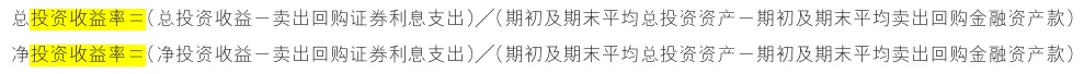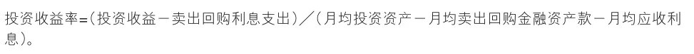投资收益率=(投资收益-卖出回购利息支出)/(月均投资资产-月均卖出回购金融资产款-月均应收利息)。