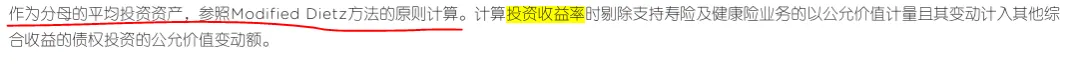 根据文字描述我们可以确定:他们的分母主要也是平均投资资产。并且都不包含FVOCI-债权的公允价值变动。同时也可以推断,综合投资收益的分子也肯定不包含FVOCI-债权的公允价值变动。这和人保和新华的公式又有很大的不同了。