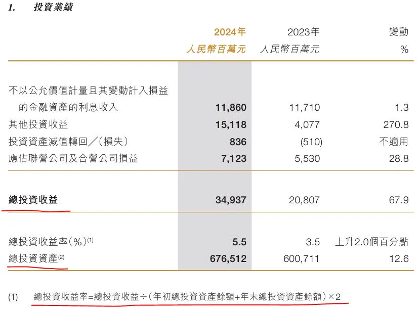 财报中,清晰地说明了总投资收益率的计算公式:总投资收益率=总投资收益/(年初总投资资产余额+年末总投资资产余额)*2。