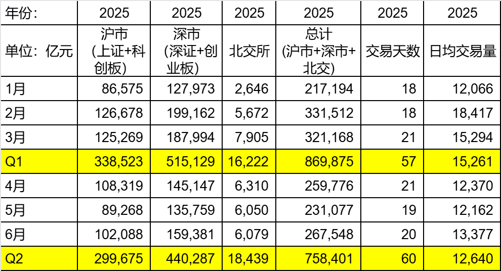我们先来看一下2025年上半年的成交量(数据来自于上交所、深交所和北交所的官网):