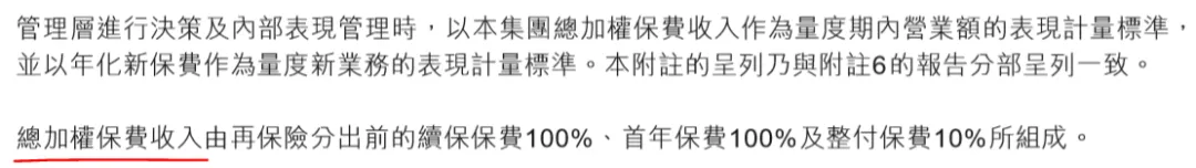 财报中,有的保险公司公布的是“规模保费”,比如平安;有的公布的是“原保险保费”。而友邦两者都不是,它用的是一个新概念,叫做“加权总保费收入”