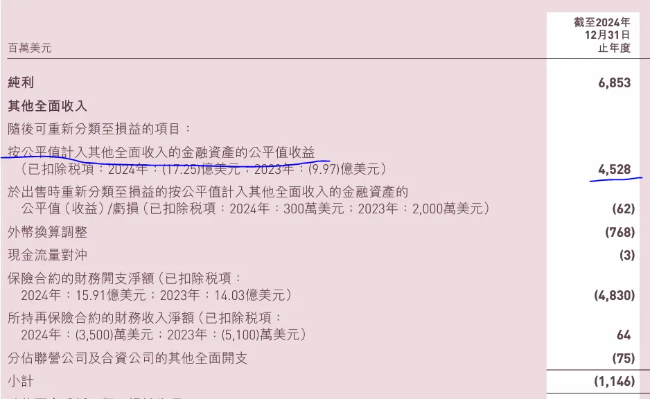 友邦财报中并没有总投资收益这个字眼,上一篇文章中论述过,友邦利润表中的“投资回报”就是总投资收益。2024年年报中这个数字是:119.37亿美元。