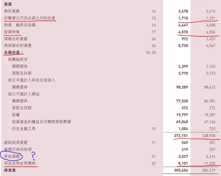 于是,我在友邦的资产负债表中一一找出了这些科目(如下图,划红色线的),唯一的疑问就是有一个科目是“其他资产”,算不算投资资产?我看了附注,里面包含的资产比较杂乱,我就拍脑袋决定不算它。由于金额很小,几乎没有影响: