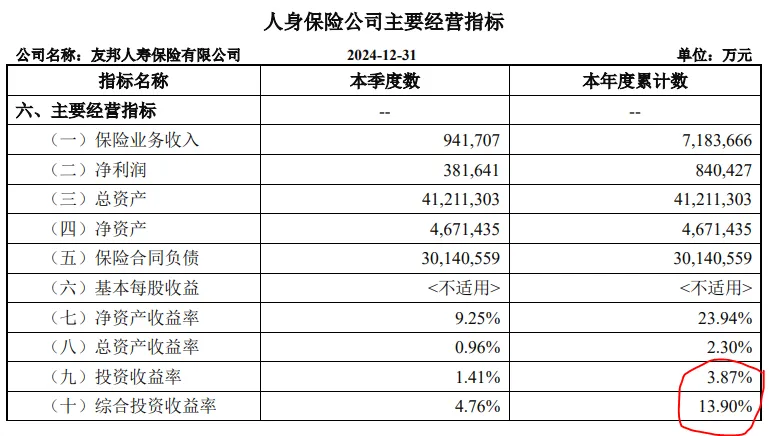 我又看了一下友邦2024年四季度偿付能力报告中的数据,和我算出来的结果有很大差异,尤其是综合投资收益率,我算出来是6.4%,偿付能力报告是13.9%:
