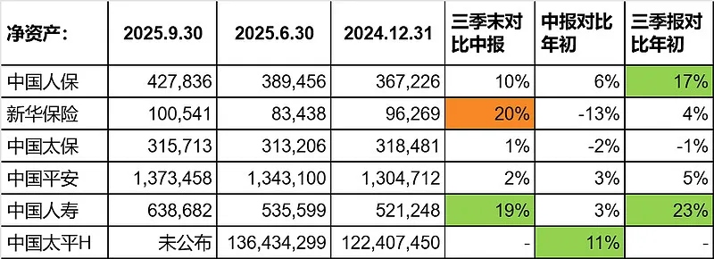 可以看到,即便是在投资收益大增的2025年,寿险公司的净资产仍然是承压的。中报时,新华和太保的净资产是负增长的,三季报后,太保仍然负增长。原因就在于利率下降后,其他综合收益也在下降,而净资产主要是净利润加上其他综合收益。而财险公司由于负债久期比较短,不存在这个问题,所以可以看到人保的净资产增速比较稳健,三季报增长了17%。