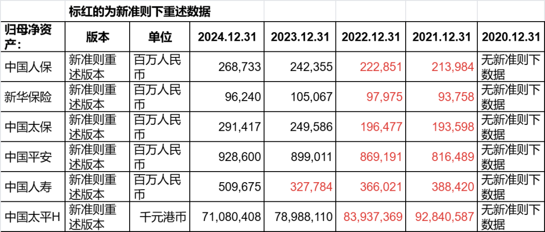 数据上需要说明的是,各大保险公司从2023年或者2024年开始执行新准则,数据只重述到了2021年。2020年及其以前的数据都是老准则下的,新老准则下数据差异很大,混着看的话数据会很乱,所以上表中我只用了2021年及其以后的数据,保证了都是新准则下统一口径的。