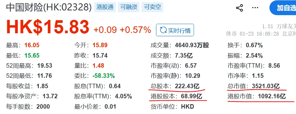 我们随便打开一个交易软件,看看中国财险的估值,以下图为例,总市值是3521亿,港股市值是1092亿,那么中国财险的市值究竟是多少?中国财险只在港股上市,为什么除了港股市值之外,还有一个总市值?