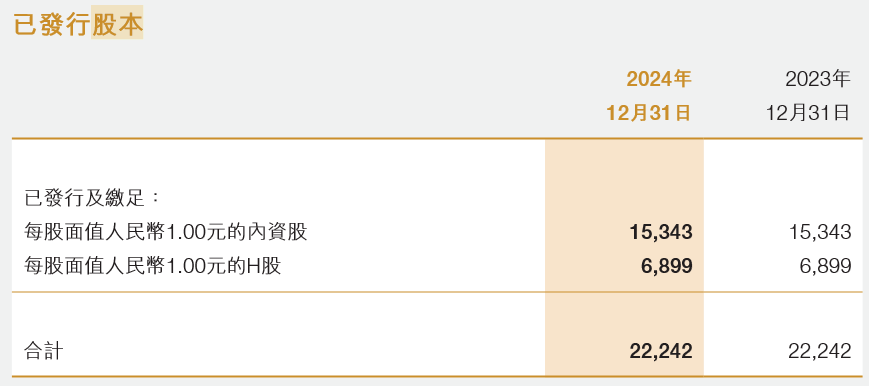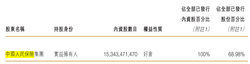 可以看到:原来中国财险的上市股份分为两个部分,一部分在港股流通,另外一部分则是内资股,所谓内资股,顾名思义就是只能在内地流通的股票,而由于中国财险在内地是没有上市的, 所以这部分内资股根本不能流通。当然,这部分股票就牢牢掌握在中国财险的控股股东中国人保的手里,财报也显示中国人保集团是唯一的内资股股东,如下图: