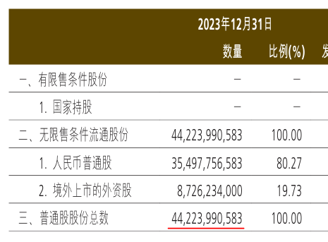 而截至2026年1月23日收盘,A股的股价是8.95人民币,H股是6.43港币。于是算出A股的市值=442.24亿*8.95人民币/汇率0.9=4398亿港币。而H股的市值=442.24亿*6.43港币=2844亿港币。
