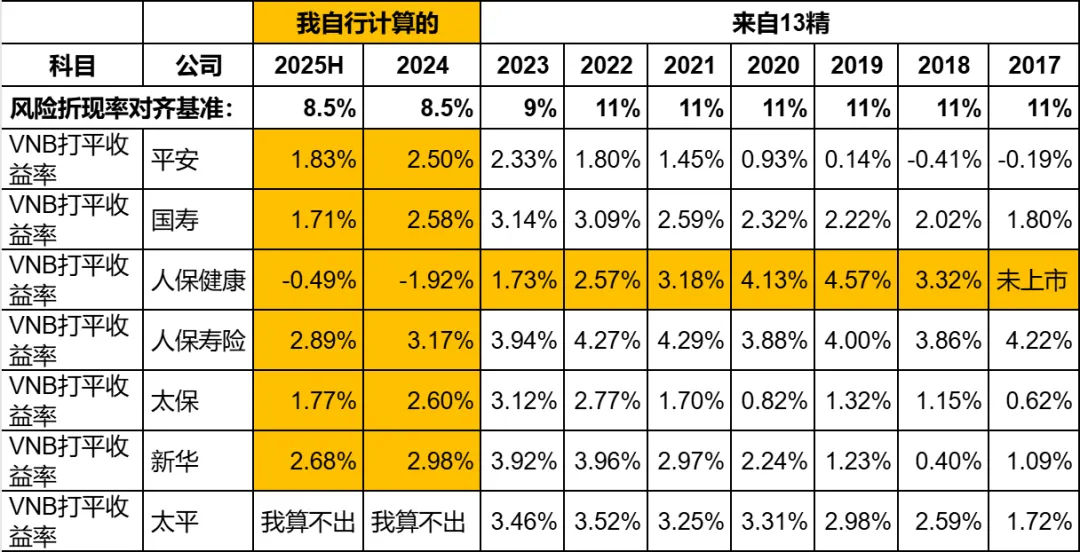 VNB打平收益率是用财报中的新业务价值的数据来计算的,所以财报中新业务价值的口径就非常重要。