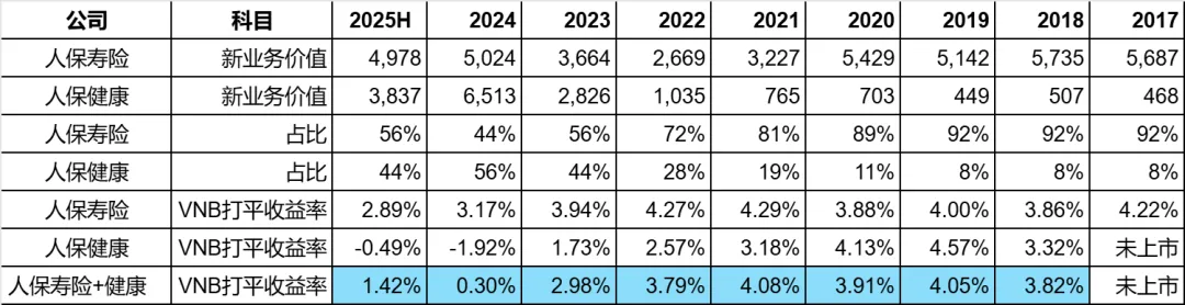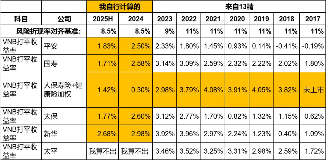 我认为,应该要把人保寿险和人保健康合在一起,再去和其他公司比较。所以我自己计算了这8年半以来人保健康的VNB打平收益率。现在的问题就是怎么合?我准备用新业务价值的数据加权来计算。