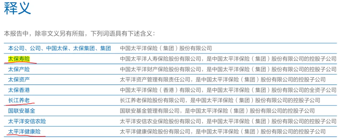 我们再看看财报的释义,这里明确了“太保寿险”四个字出现在财报中的时候,就是指寿险子公司。而太保还有自己的健康险和养老子公司,有别于寿险子公司。