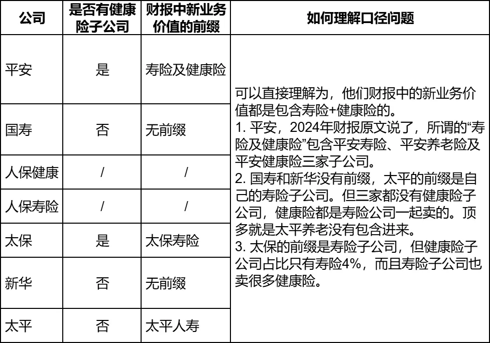 总结一下就是:6家公司财报中新业务价值的口径我们可以当做是一致的,都包含了寿险和健康险,或者说绝大部分健康险(或者健康险本身占比太小)。