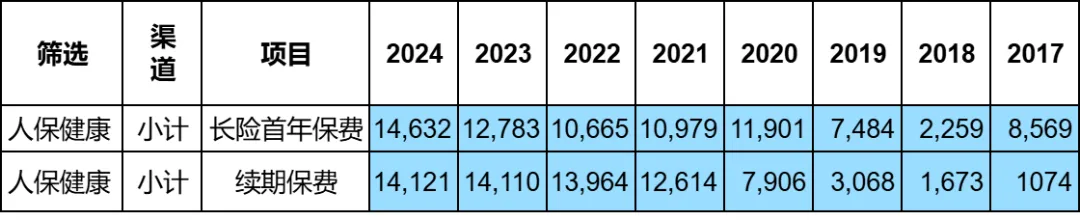 相比之下,医疗险只能算个苦差事了,由于人保健康50%的业务是医疗险,所以呈现出新业务保费很高,但是续期保费很低的数据。