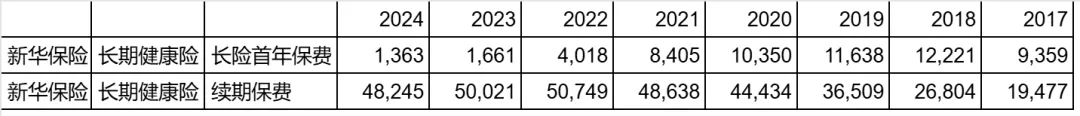 从长险首年数据可以看出,新华最好的年份,是2017到2020年,那是重疾险大卖的年代,当时新华主要卖的应该是重疾险,重疾险的投保期限可是比医疗险长多了,动辄20年。这大概率是新华这些年续期保费如此稳定的原因。自那以后,新华的长期健康险新业务跌到可以忽略不计了。