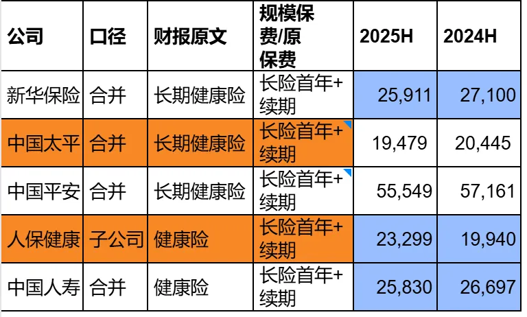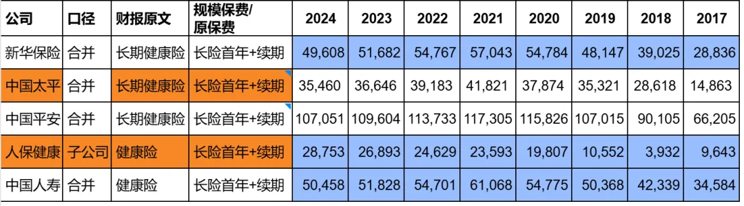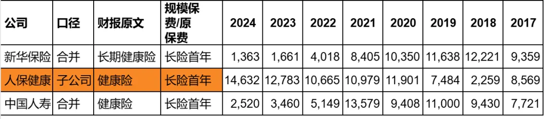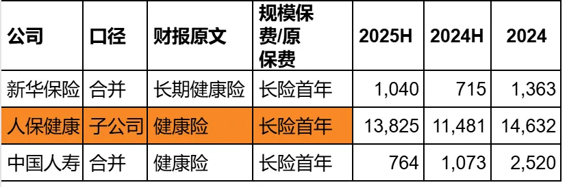 还是先说一下数据口径的问题。这个数据,只有3家公司财报中提供了,也就是新华和国寿的合并数据,以及人保的子公司人保健康的数据。平安和太平提供的只是长期健康险的总数据(也就是长险首年+续期),比如平安提供的如下: