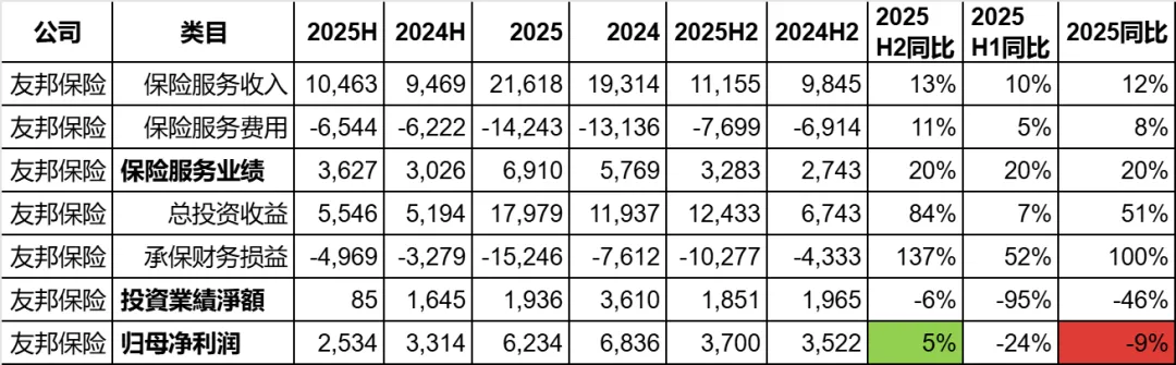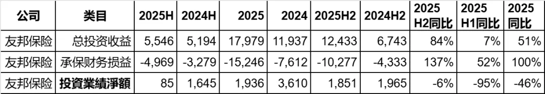 在2025年中报分析时,我们已经提到友邦的投资业绩是有一些问题的,首先投资收益增速很小,但是承保财务损益由于分红险的原因大幅度增加,导致整体的投资业绩大幅下跌。