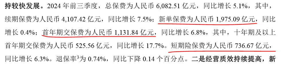 1. 2024年Q3的数据是国寿财报原文提供的,但是长险首年保费的1131亿+短期险的736亿,并不等于新业务保费的1975亿。差了一百多亿。