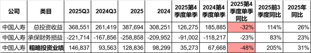 四季度单季,总投资收益减少了32%,导致投资业绩几乎同比砍半。保险公司四季度的投资表现整体都不太好。