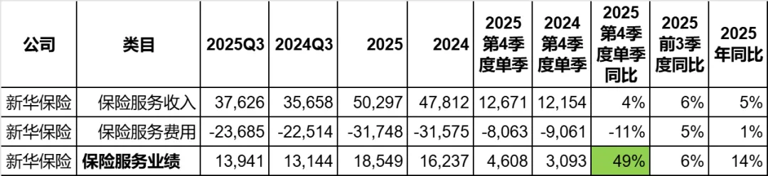 四季度单季,新华的保险服务业绩大涨49%。但是大涨的原因,也是控制住了保险服务费用,保险服务收入的增幅其实和同行差不多。