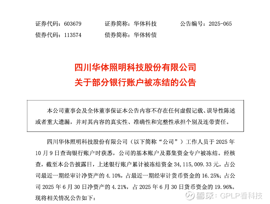 10月9日晚间,华体科技(603679)发布公告披露,公司基本账户及募集资金专户遭司法冻结,合计冻结金额达3411万元。
