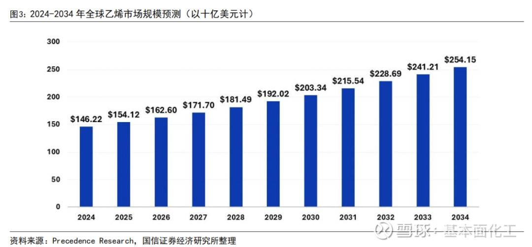 预计2025-2034年全球乙烯市场规模CAGR约5.68%。据Precedence Research数据,2024年全球乙烯市场规模为1462.2亿美元,预计到2034年将超过约2541.5亿美元,即2025-2034年的预测期内复合年增长率将达到5.68%。