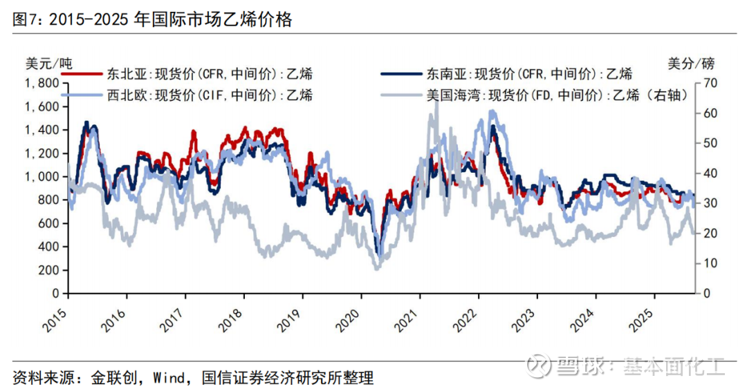 目前国际乙烯价格处于十年相对低位。2015-2025年间国际市场乙烯价格呈现一定程度的区域差异化特征,主要受原料成本、供需关系和贸易格局影响。东北亚和东南亚市场价格相对较高且联动性强(相关系数达0.94),主要因两地临近石化产业集群,共享相似的成本结构和季节性需求波动。相比之下,西北欧价格波动更为剧烈,反映其受能源价格和环保政策变动的敏感性更高。美国海湾地区因依托廉价乙烷资源,价格长期处于洼地,其与亚洲市场的价差体现了跨区套利的空间。此外,2021-2022年全球能源危机期间各区域均出现极端高价,凸显原料成本传导对短期价格的共同驱动作用。