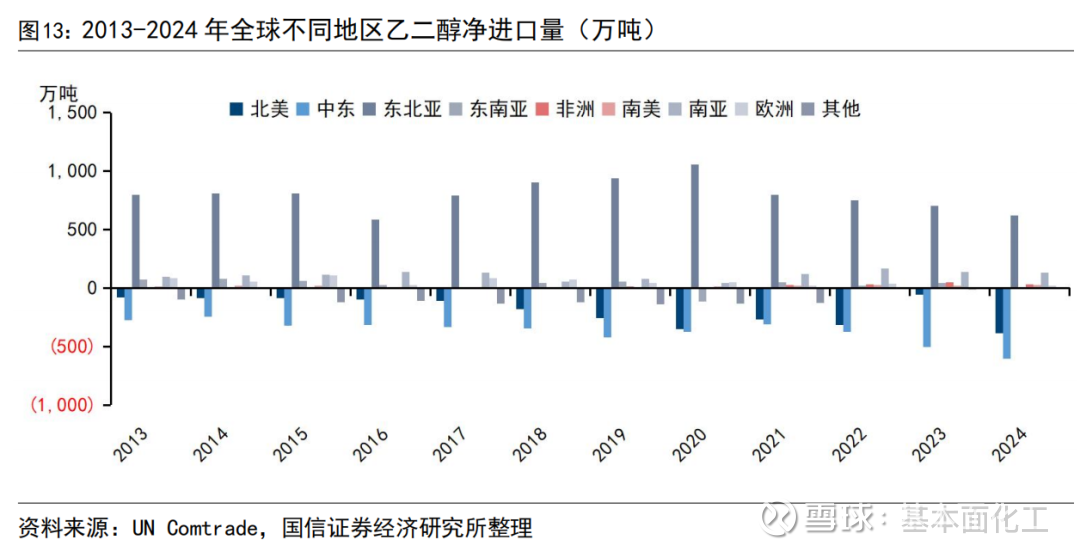 东北亚进口规模从2020年峰值1058.1万吨降至2024年617.6万吨,国内煤制乙二醇产能提升至398.8万吨发挥替代作用,但进口依存度仍较高;东南亚呈现波动,2020年净出口116.8万吨后回落至2024年净出口2.6万吨,马来西亚、印尼新增产能与越南、泰国聚酯需求增长形成平衡。