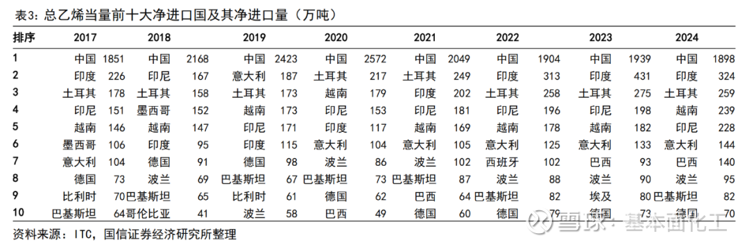 中国稳居净进口量首位。总乙烯当量前十大净进口国呈现亚洲主导特征,尤其是中国和印度。中国稳居净进口量首位,2020年达到2572万吨的峰值,后续略有回落或受益于国内新增产能逐步释放,但净进口量始终保持高位领先。除了中印之外,亚洲的印度尼西亚、越南等新兴经济体也一直处于前十,需求旺盛且自身产能较为有限。欧洲的意大利、波兰、德国净进口量靠前,能源转型导致本土产能收缩、进口依赖度较高。