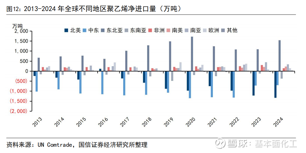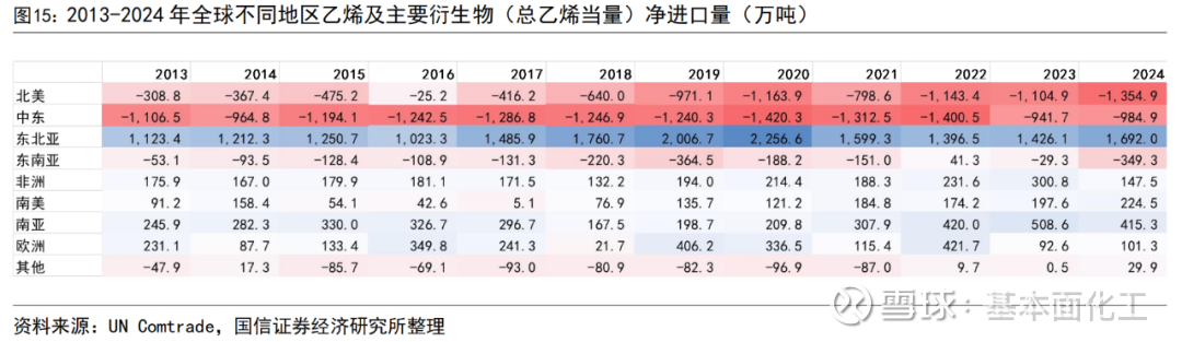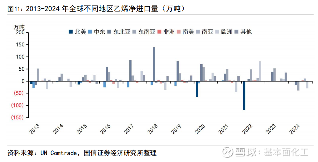 东北亚2018年净进口140.1万吨达到需求高峰后净进口量回落;东南亚2024年净出口38.5万吨,乐天化学印尼100万吨/年乙烯装置(2025年5月投用)的投产预期提前拉动出口转型。