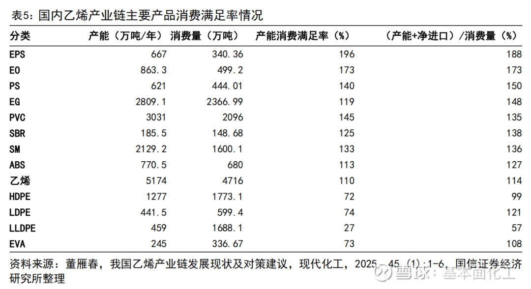 中国乙烯存在总量缺口但结构性矛盾突出,大宗产品过剩与高端产品依赖进口并存。2023年中国乙烯表观消费量4878万吨,当量消费量6865万吨(含衍生物净进口折算),自给率仅68.2%,仍需进口大量高端产品;但大宗通用产品已现过剩,2023年聚乙烯(PE)产能2981万吨,表观消费量3698万吨,自给率68.5%,其中低密度聚乙烯(LDPE)自给率仅52.9%,而PVC、苯乙烯等产品产能消费比超130%,同质化竞争激烈。高端产品方面,2023年POE消费量84.8万吨几乎全进口,茂金属聚乙烯对外依存度超90%,光伏级EVA进口依存度42%,高端聚烯烃整体自给率仅56.7%,结构性短缺成为行业核心痛点。