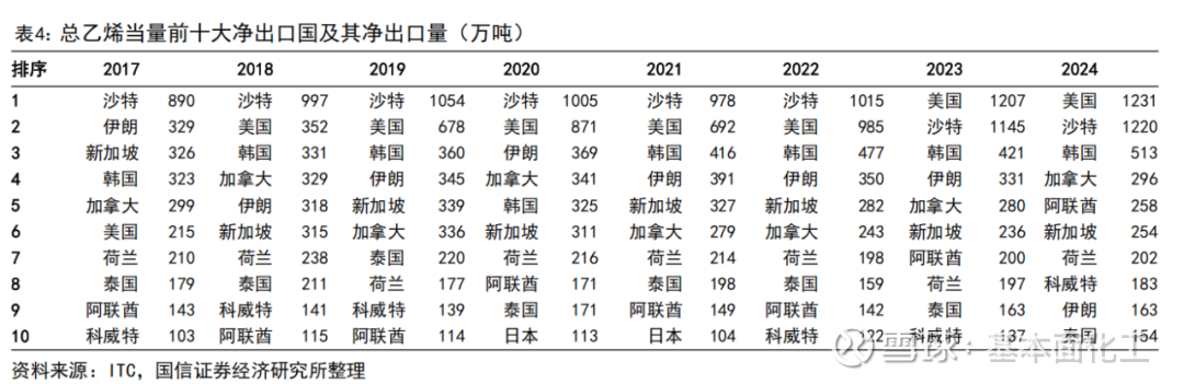 自2018年以来,沙特、美国长期位列净出口国前列。沙特依托天然气资源长期稳居榜首,美国借页岩气革命实现跨越式崛起,二者形成“双寡头”。中东地区除沙特外,伊朗、阿联酋、科威特均长期稳居前十,北美地区的加拿大同样表现稳健,与美国共同构成北美出口双支柱。东亚及东南亚则以韩国、新加坡、泰国为代表;新加坡依托中转港口与炼化一体化基地,始终位列前十;泰国则凭借东南亚下游加工需求带动的产能配套,长期保持净出口;日本近年来净出口量下滑,或可归因于其国内炼化产能老化、产业重心向高端化转移导致基础化工品出口减少;荷兰依托鹿特丹港的物流优势与炼化一体化基地,成为欧洲最核心的总乙烯当量出口国。