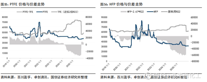 总结来看,内贸价格方面,根据百川盈孚、卓创咨询,本月R22报价提升至1.6万元/吨,较上月+1000元/吨;R134a报价提升至5.8万元/吨,较上月+2500元/吨;R125报价提升至4.75万元/吨,较上月+2500元/吨;R32报价维持6.25万元/吨;R410a报价提升至5.45万元/吨,较上月+1500元/吨;R152a维持报价2.7万元/吨;R142b维持报价2.85万元/吨;R143a维持报价4.6万元/吨。