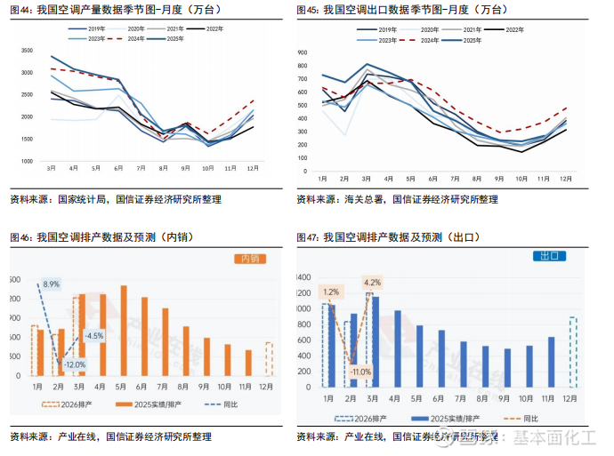 据产业在线,2025年上半年空调内销排产数据持续上涨,其中1-2月让步出口被动减量,3月逐步起量,除季节性备货因素影响,两新政策推动也有较大促进,5-6月随着618大促节点临近叠加需求旺季,排产表现强势增长。进入夏季东北、山东、河南等多地高温天气带动空调终端市场销量提升,行业库存进一步消化。四季度家用空调排产呈现下滑趋势,一方面受到去年国补基数较高影响;另一方面受铜价、制冷剂价格持续上涨,对空调生产企业带来一定成本压力,带来排产的谨慎和收缩。2026年前两月排产出现分化,两月累计排产与2025年高基数持平,1月受元旦假期以及部分企业前置2月春节排产影响,内销排产推高。出口方面,根据海关数据显示,1-11月我国空调累计出口5516万台,同比-2.9%,出口市场自5月起开始出现下滑趋势,去年同期高基数叠加前期抢出口备货带来的库存压力,连续8个月同比下滑。年底海外圣诞旺季后进入常规补货周期,为避免春节假期影响交付延迟,部分2月订单提前至1月,但欧美旺季已过,新增订单增速放缓。此外部分企业海外排产规划有所提升,整体供应链效率和订单响应速度提升。