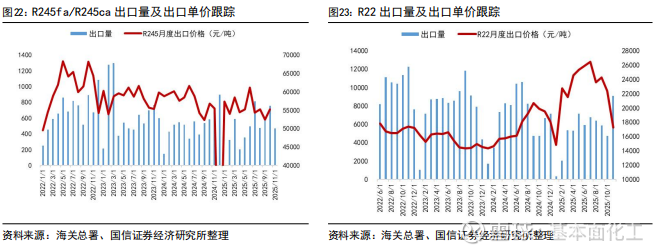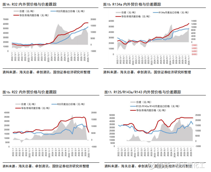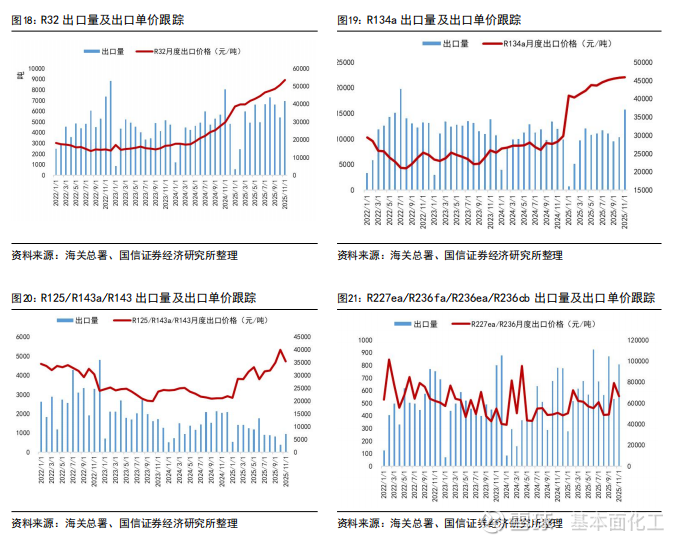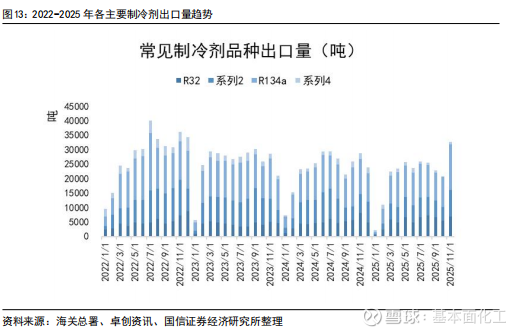 2025年1-11月,R22出口5.90万吨,同比下降21%;R32出口5.84万吨,同比增长12%;R134a出口10.8万吨,同比下降6%。从出口数据来看,制冷剂海外需求持续增长以R32为主,R22受配额削减影响,同比下滑为正常趋势。从11月数据来看:R22同比增长36%,R32同比下滑13%,R134a同比增长31%,R125/143系列同比下滑54%。