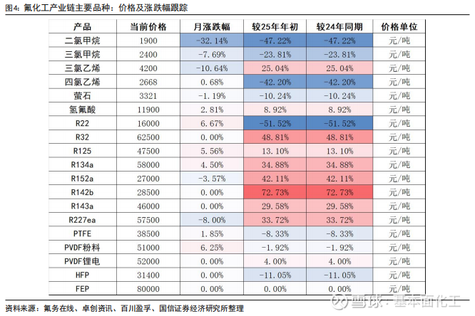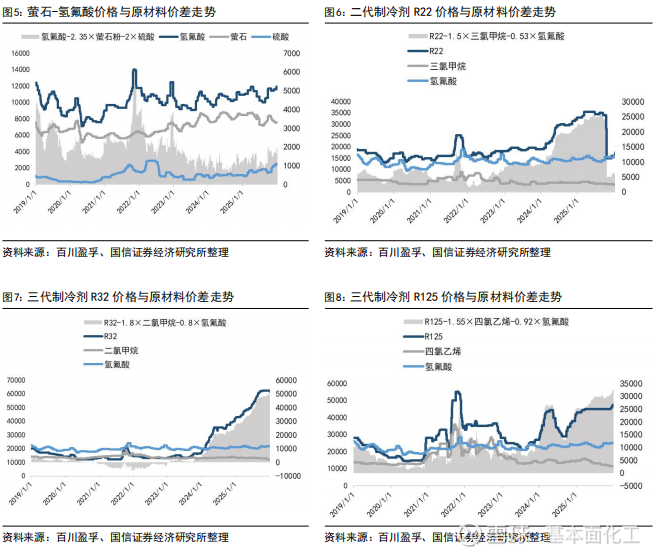 R125、R134a、R410a报价持续上涨。根据百川盈孚、卓创咨询,本月R134a报价提升至5.8万元/吨,较上月+2500元/吨;R125报价提升至4.75万元/吨,较上月+2500元/吨;R32报价维持6.25万元/吨;R410a报价提升至5.45万元/吨,较上月+1500元/吨;R152a维持报价2.7万元/吨;R142b维持报价2.85万元/吨;R143a维持报价4.6万元/吨。