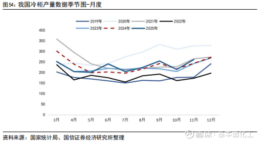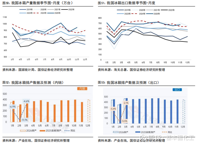 冰箱:根据产业在线,2025年初受企业备货、国补政策延续影响,2025年一季度整体排产延续增长趋势。5-6月排产受五一促销叠加618电商大促,终端销售环比改善,消费者需求有效激活。随着618大促结束,叠加传统淡季消费动能不足,三季度排产呈现下行趋势。四季度多地补贴政策频繁调整,终端市场需求受到抑制,叠加2024年四季度国补政策下内销高基数,今年四季度冰箱内销整体呈逐步下行趋势。出口方面,2024年冰箱出口已经连续两年实现双位数增长,创下历史最高值。在历史基数较高的压力下,叠加海外传统消费区库存压力上升,欧洲补库接近尾声,2025年冰箱出口压力较大,2025年一季度出口主要来自亚洲、拉美、非洲等新兴市场;二季度受美国加征关税影响,冰箱出口进入下行通道,部分企业暂停了输美业务,并转移订单至海外工厂。三季度出口区域出现分化:欧美等传统市场表现疲软,非洲、拉美等新兴市场成为拉动出口增长的主力。预计四季度冰箱出口排产延续震荡走势。根据海关总署,2025年1-11月,我国冰箱累计出口7490万台,同比+1.2%。根据产业在线预测,2026年1月冰箱内销排产352万台,较去年实绩下降6.9%;出口排产440万台,较去年实绩下降3.4%。