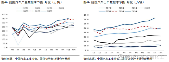 2025年我国汽车出口增长的势头仍在延续。据中国汽车工业协会数据,2023年,我国汽车产销量分别达3016.1万辆和3009.4万辆,同比分别增长11.6%和12%,年产销量双双创历史新高。2023年电动化和智能化的浪潮等助推汽车行业稳定增长,我国成为全球最大汽车出口国。据中汽协数据,2024年全年,汽车产销累计完成3128.2万辆和3143.6万辆,同比分别增长4.5%和4.8%。2025年1-11月,汽车产销量分别为3123.1万辆和3112.7万辆,分别同比增长10.8%和11.4%。海外市场方面,2024全年,汽车整体出口达到584.7万辆,同比增长20.5%。2025年1-11月,汽车整体出口为631.0万辆,同比增长18.2%。