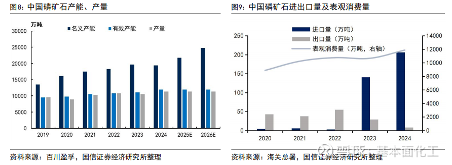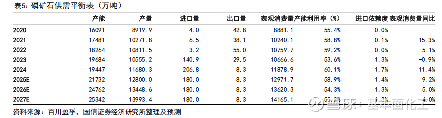 新增产能落地率或较为有限,进口难改紧平衡格局。尽管2025-2027年规划新增名义产能合计达0.59亿吨,但结合历史经验及当前政策环境、矿山开采难度及品位限制等情况,预计实际有效新增产能落地比例可能不足40%,即三年仅约0.24亿吨以内能形成真实供应。与此同时,进口虽在2024年增至207万吨(同比+46.8%),但占消费比重仍低于2%,且受内陆主产区运输成本制约,进口矿难以形成有效补充。综合来看,2025-2027年磷矿石表观消费量或将稳步升至1.42亿吨,而有效供给增速有限,供需紧平衡格局和价格高位运行态势有望持续。