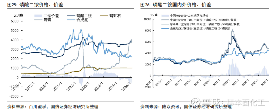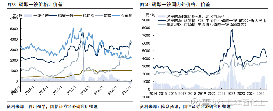 出口政策影响市场,近年来海内外价差两度走阔。出口政策影响市场,海内外价差走阔。2021-2022年,在全球粮食安全担忧、化肥需求激增背景下,叠加中国阶段性出口放行,国际价格(波罗的海FOB)飙升至7000元/吨以上,显著高于国内,价差一度扩大至超过3000元/吨。2022年下半年起,尽管中国实施严格的磷酸一铵出口法检与配额限制,但国际价格仍持续回落,主因全球供需格局逆转,摩洛哥、沙特等非中国主产国产能加速释放,填补供应缺口;同时,高粮价和化肥成本抑制下游采购意愿,叠加欧洲能源价格大幅回落,削弱成本支撑,共同推动国际价格从高位下行。然而,自2024年以来,国内外价差再度显著扩大,高峰期差距约至2000元/吨。这一轮价差走阔的核心原因正是中国持续的出口总量控制政策,在“国内优先、适当出口”原则下,出口配额集中于5-9月且总量受限,导致国内大量产能转向内销,压制国内市场价格;而国际市场因俄乌冲突持续、俄罗斯磷肥出口受阻、南美及印度库存低位补货需求旺盛,价格维持高位,也使拥有出口配额的企业显著受益。