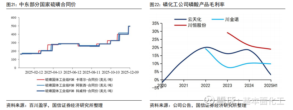 成本端硫磺供需偏紧,地缘冲突加剧供给紧张,价格快速上涨。硫磺主要伴生于油气开采及炼化,未来油气消费增速下降,高硫原油生产有所下降,全球硫磺产量增速预期较低。硫磺最重要应用为制备硫酸,硫酸需求预计仍将保持中速增长,拉动硫磺需求增长,综合来看全球硫磺供需偏紧。俄罗斯本为全球第二大硫磺生产国,2025年来其炼厂持续受袭,直接影响了气硫磺的生产和出口,加剧硫磺供应紧张。市场目前已经接受俄罗斯硫磺出口降低的现状,但随着冲突的持续进行,经俄罗斯出口的部分中亚国家生产硫磺供应有受阻风险。市场更加青睐供应稳定的中东硫磺,这进一步推高了中东硫磺价格。2025年初中东硫磺合同价为163-165美元/吨,年末中东多个国家分别上调了硫磺12月份官方合同价格至495美元/吨,折合人民币到岸价约4250元/吨左右。