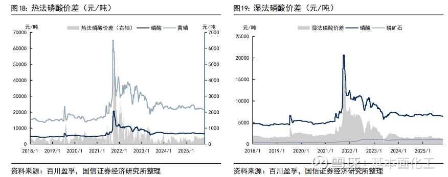 磷酸价格经历2018-2021年温和上行,受环保限产与需求回升推动;2021-2022年爆发式上涨,因新能源拉动及供应紧张,磷酸价格一度突破2万元/吨;随后进入2022-2025年下行通道,产能释放叠加需求放缓,价差持续回落并趋于稳定。