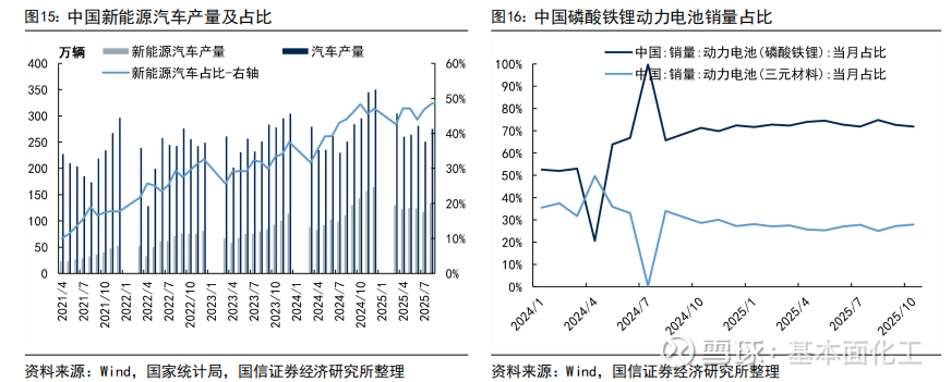 新能源车与储能双轮驱动,贡献磷矿石重要下游增量。近些年来,在国内相关政策支持、锂电技术进步、消费者对新能源汽车接受程度提高等背景下,我国新能源汽车产业快速发展,据国家统计局数据,截至2025年10月底,我国汽车产量2287万辆,其中新能源汽车产量1080万辆,占比47%。2024年我国磷酸铁锂电池在动力电池领域市占率达68%;凭借高温下结构稳定、安全性高、循环寿命不低于15年等优势,磷酸铁锂电池在储能领域占据垄断地位。受益于新能源汽车市场快速增长与储能领域持续扩展,我国锂电池产量规模不断扩大,带动磷酸铁锂正极材料出货量大幅攀升,根据则言咨询数据,2024年出货量达244.5万吨,同比增长54.1%,较2020年的16.35万吨增长超14.95倍。
